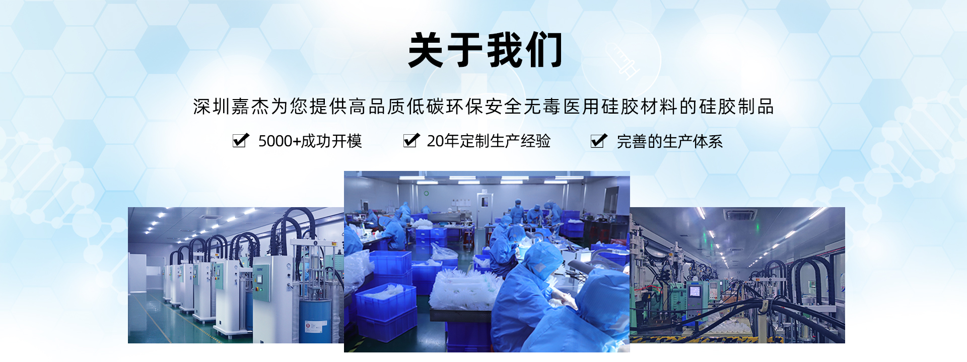 深圳市嘉杰橡塑有限公司是廣東深圳地區專業集生產、研發為一體的硅膠制品生產廠家,主營硅膠管、醫用硅膠管、醫用硅膠制品、液態硅膠制品、發泡硅膠制品、硅膠密封制品等各大系列硅膠產品,擁有十萬級潔凈車間、液態無塵車間、模壓車間、擠出車間,現代化的精密機器設備和一體化的科技生產線,廠房面積6000余平方米,60噸/月產能,硅膠產品20余年研發生產經驗,用產品說話,用實力證明,竭誠為您服務。