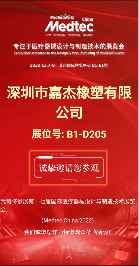 第十七屆國際醫(yī)療器械設計于制造技術展覽會,深圳嘉杰橡塑有限公司誠摯邀請您參觀!深圳嘉杰橡塑有限公司成立于2007年,位于廣東深圳,公司集研發(fā),制造,經營級服務一體,主要從事硅橡膠醫(yī)療耗材系列產品的研發(fā)和生產。