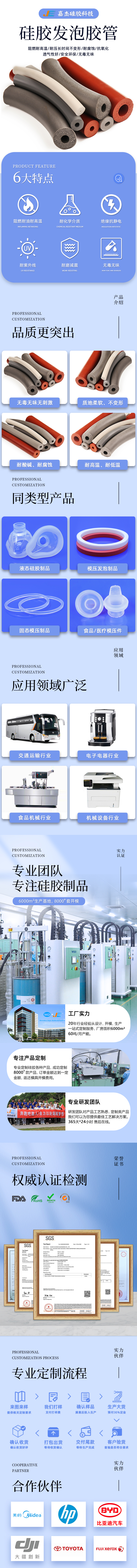 又稱發泡海綿管,為形似海綿、可耐高溫的發泡硅膠管,海綿硅膠制品分分擠出、模壓兩種制作工藝,如硅膠海